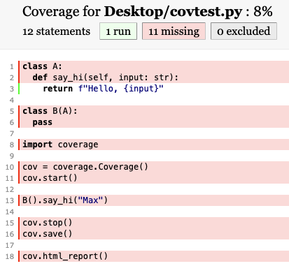 To address this case, we needed to understand the inheritance chain for any method call. There might be a way to do this with coverage.py, but I didn't find it. I was aware of Dropbox's pyannotate and thought that their runtime based type evaluation sounded pretty similar to this. After poking around the code for a bit, I stumbled across this method. There's a lot to it that we won't unpack here, but it's a really interesting idea and may be worth a read if you've got some time. We took inspiration from this and bypassed coverage.py in favor of using sys.settrace directly.