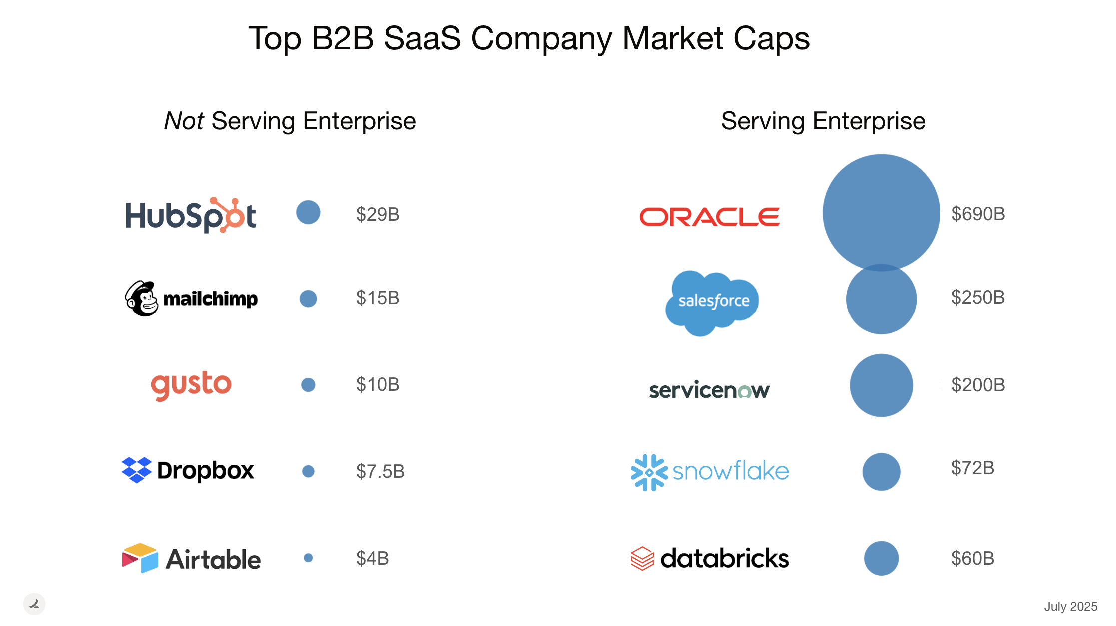 It's clear that the largest B2B SaaS businesses in the world win in enterprise. And it's not just market cap size, but also the growth rates of these businesses. The average CAGR (compound annual growth rate) of the non-enterprise group is 15.2%, and of the enterprise group is 29.6%.