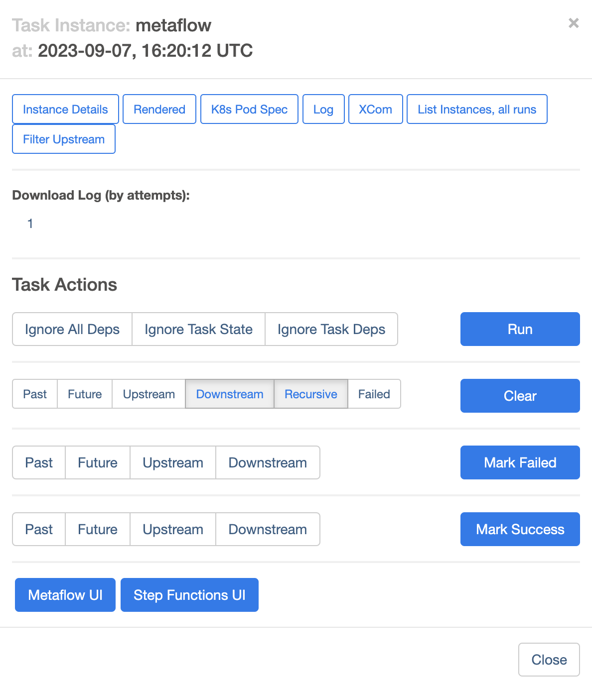 At first, we used the Amazon provider to integrate between Step Functions and Airflow—namely, StepFunctionStartExecutionOperator and StepFunctionExecutionSensor. However, this wasn’t pleasant. Data scientists had to create two boilerplate tasks to trigger execution, using Step Function state machine ARNs that make little sense in the context of Metaflow and data science. Then, if something went wrong, data scientists had to track down logs either in the AWS Console, the Metaflow UI, or both. This wasn’t ideal.
