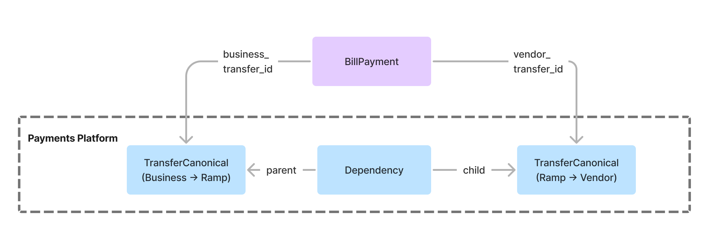 This design proved sufficient for our initial BillPay launch, but we ran into another limitation when we started work on physical check payments: while bills paid via check consisted of a single transfer or "leg" (a check cut from the business's bank account and mailed directly to the vendor), bills paid via ACH consisted of 2 legs (an ACH debit from business to Ramp, followed by an ACH credit from Ramp to vendor). Although we could easily model any of these legs as InstructedTransfer's, each BillPayment now had to store either one or two InstructedTransfer IDs, depending on the payment method. Making one of these IDs nullable didn't feel right, nor did forcing BillPay to create separate data models for check-based and ACH-based bill payments. What would happen if we ever wanted to add a third payment method, or support payments with 3 or more legs?