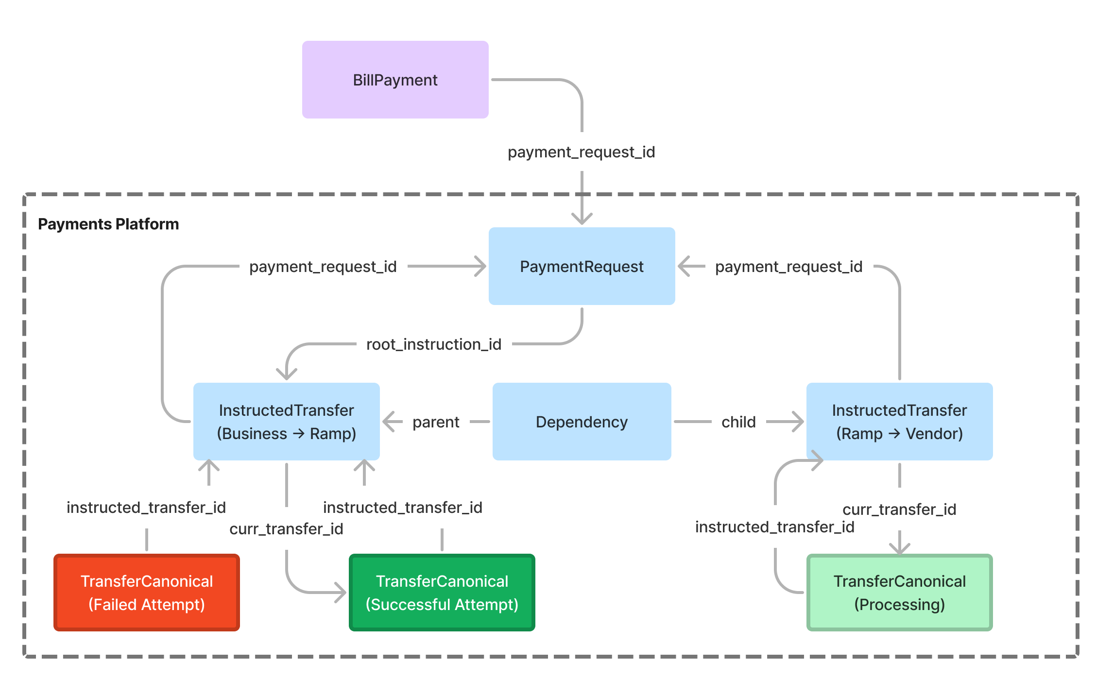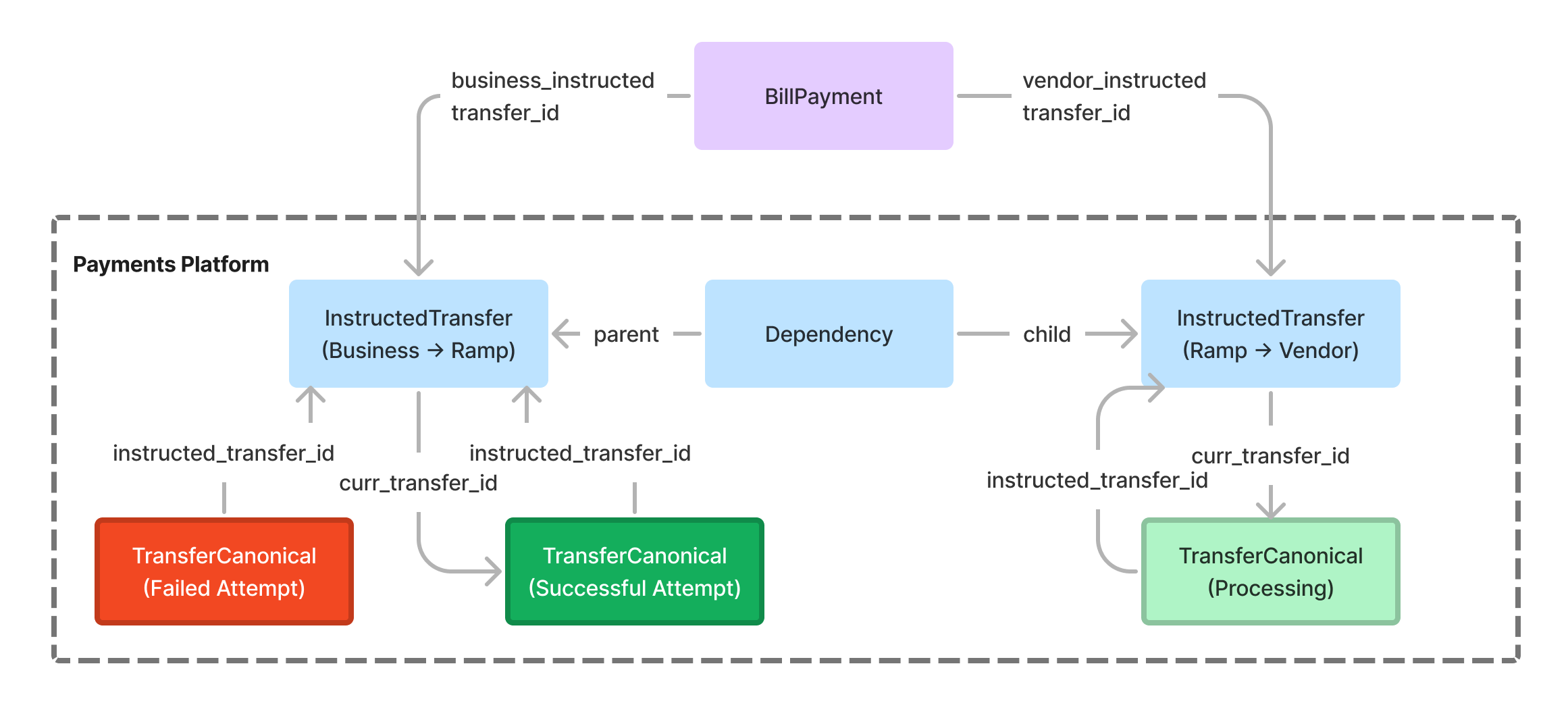 Any time a new transfer is initiated via a call to the payments service, we actually create two objects: an InstructedTransfer, and a TransferCanonical that points to that InstructedTransfer via a foreign key. Retries of failed TransferCanonical's result in a new TransferCanonical object pointing to the same InstructedTransfer, while the InstructedTransfer always maintains a pointer to the current, active TransferCanonical via the curr_transfer_id foreign key. This allows clients to treat InstructedTransfer as a single, immutable touchpoint and to safely retry transfers without losing any event history or relationship data!