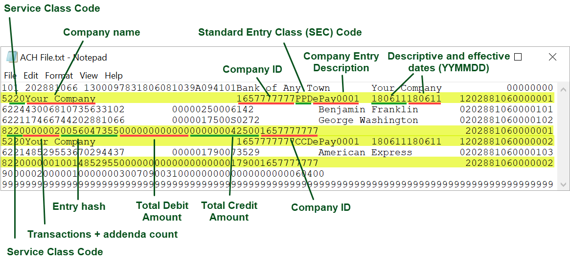 That's not hyperbole; anytime we wanted to "post" a new ACH transfer to our partner bank JPM via the legacy payments system, we had to generate a text file formatted according to a specification established by NACHA all the way back in 1974. These NACHA files must adhere to a fixed-width template in which every line is exactly 94 characters long; this allows banks to extract transfer-specific information by reading characters at specific positions within the file. Here's an example of what a NACHA entry for a single ACH payment looks like: