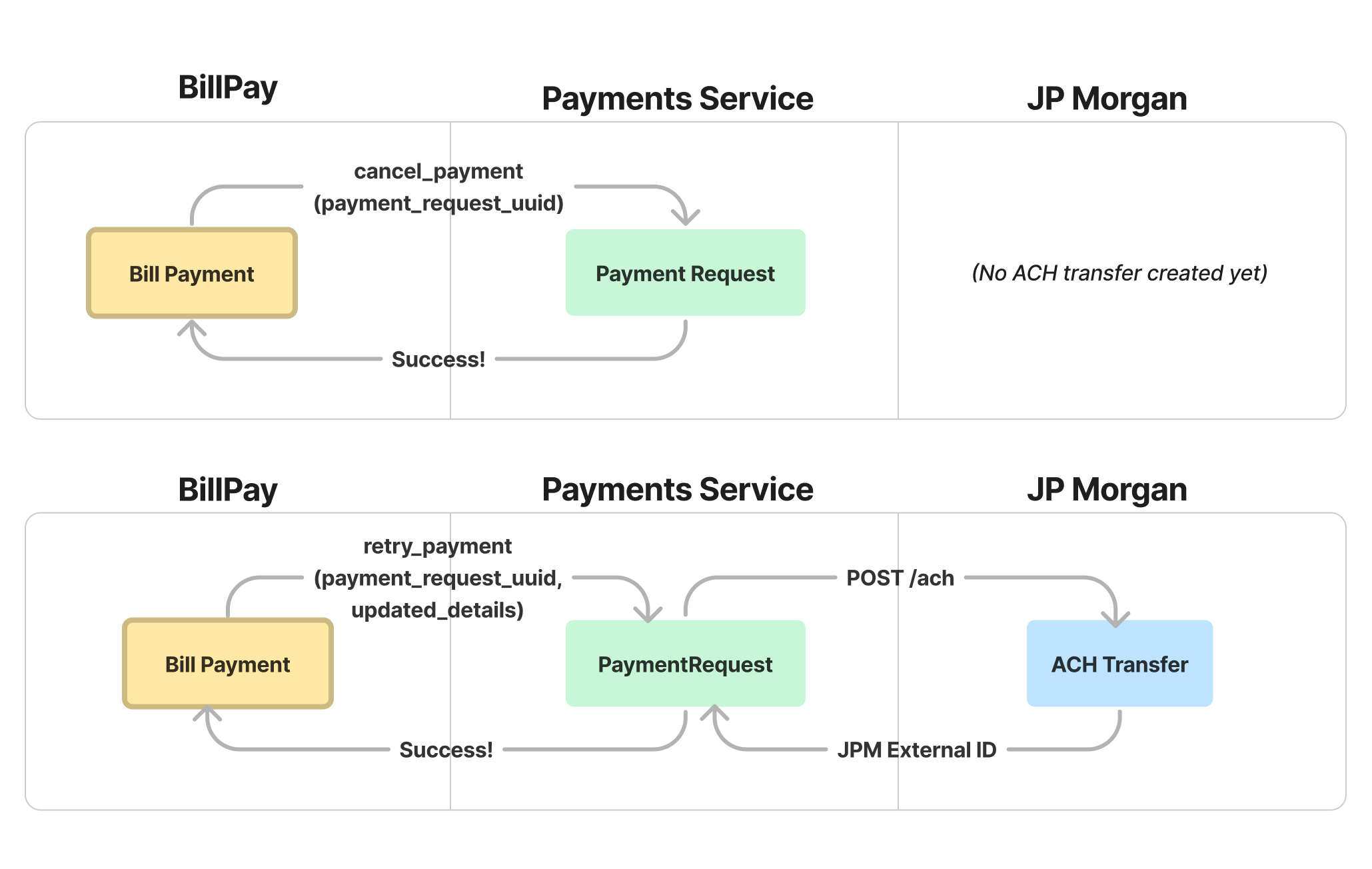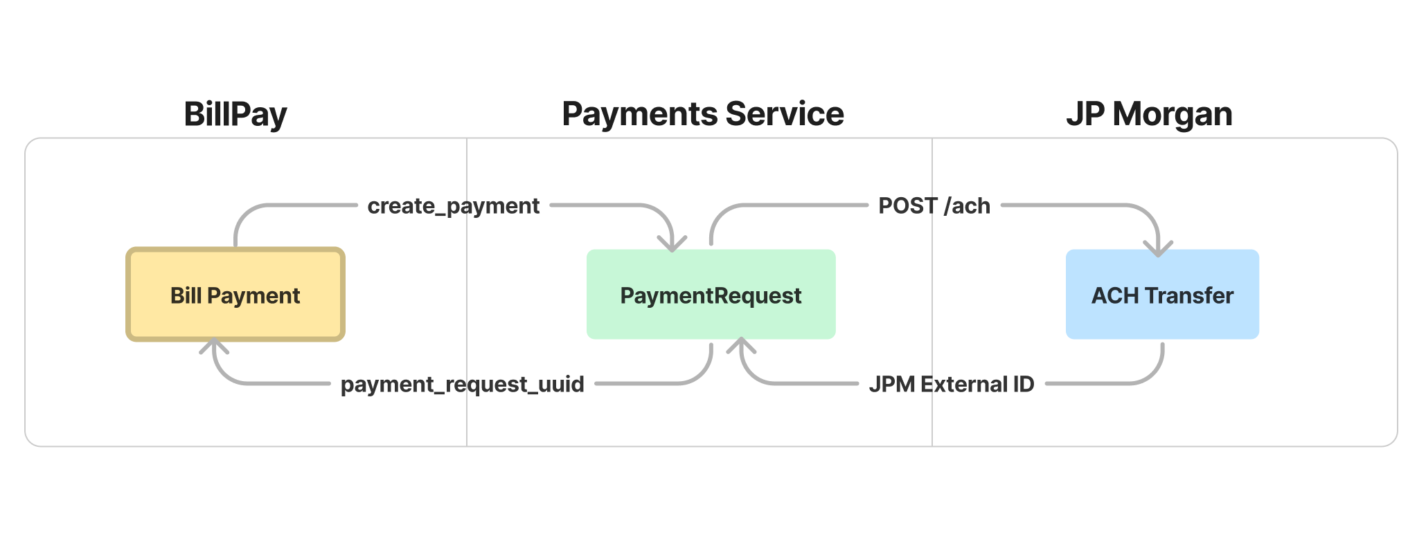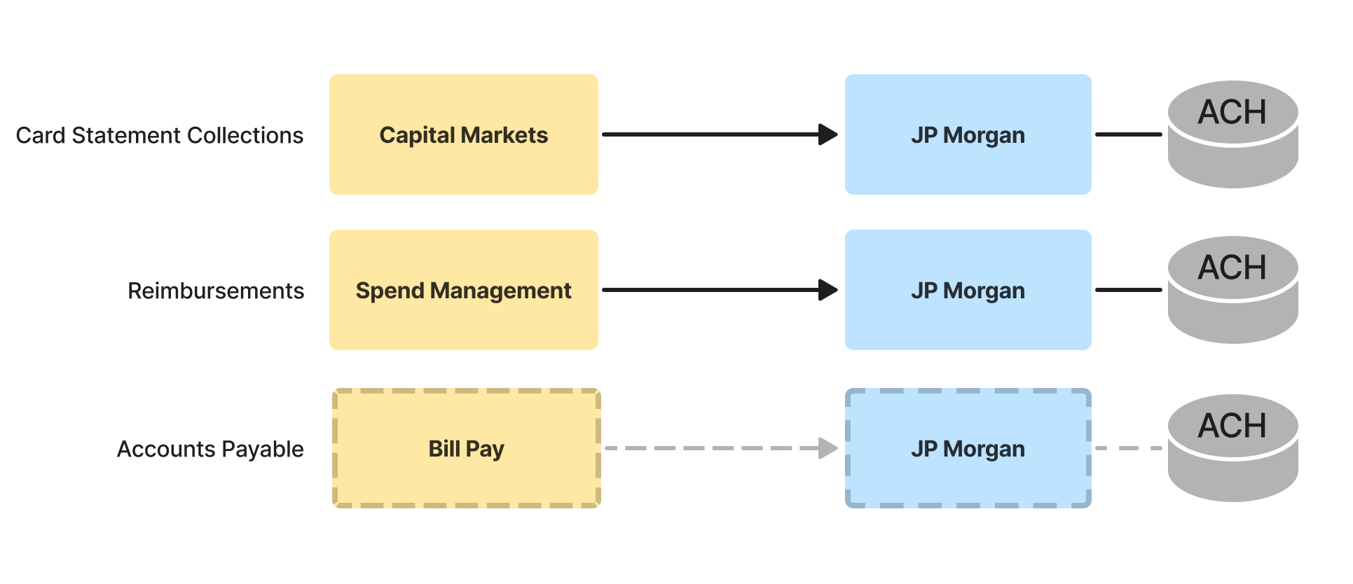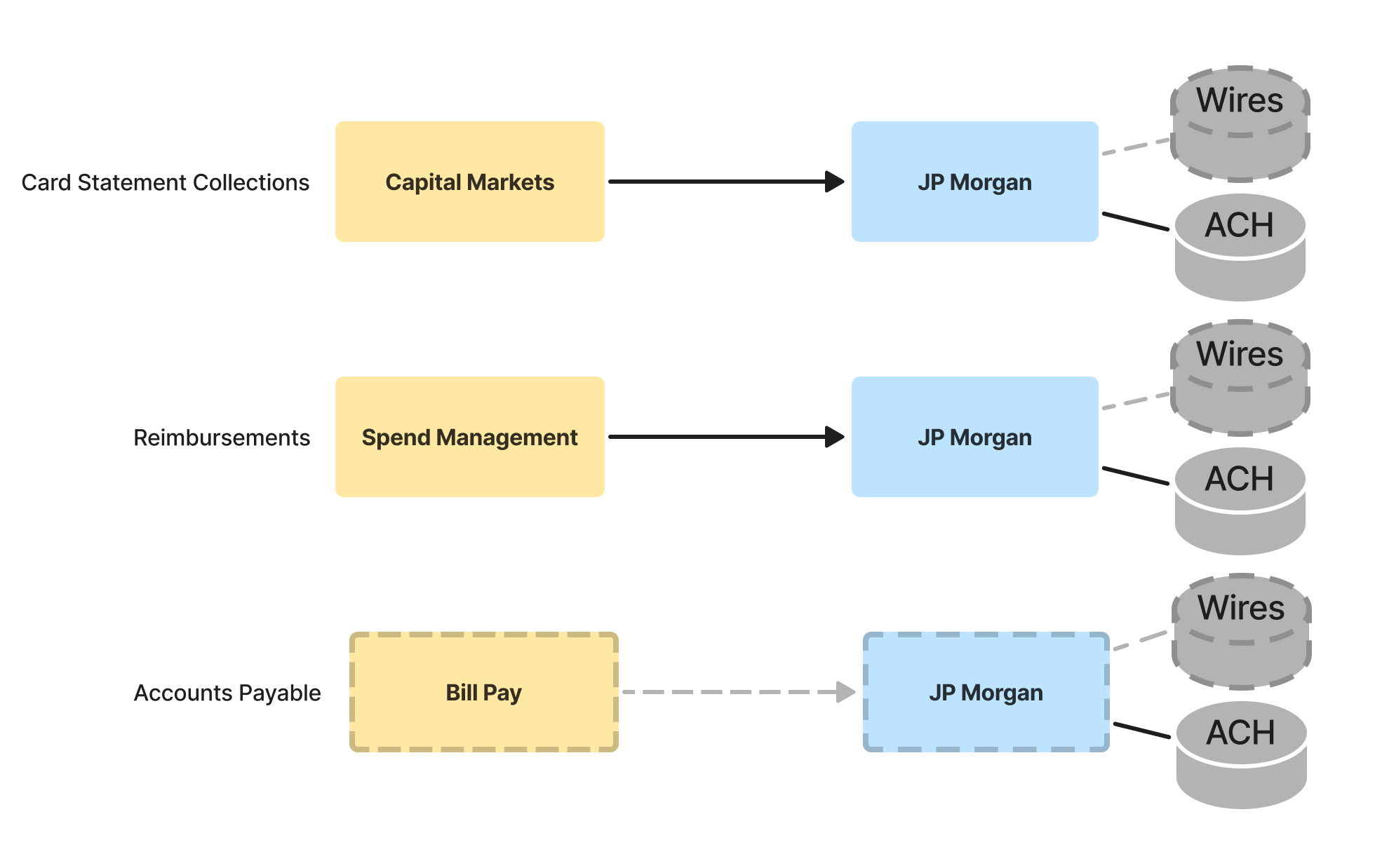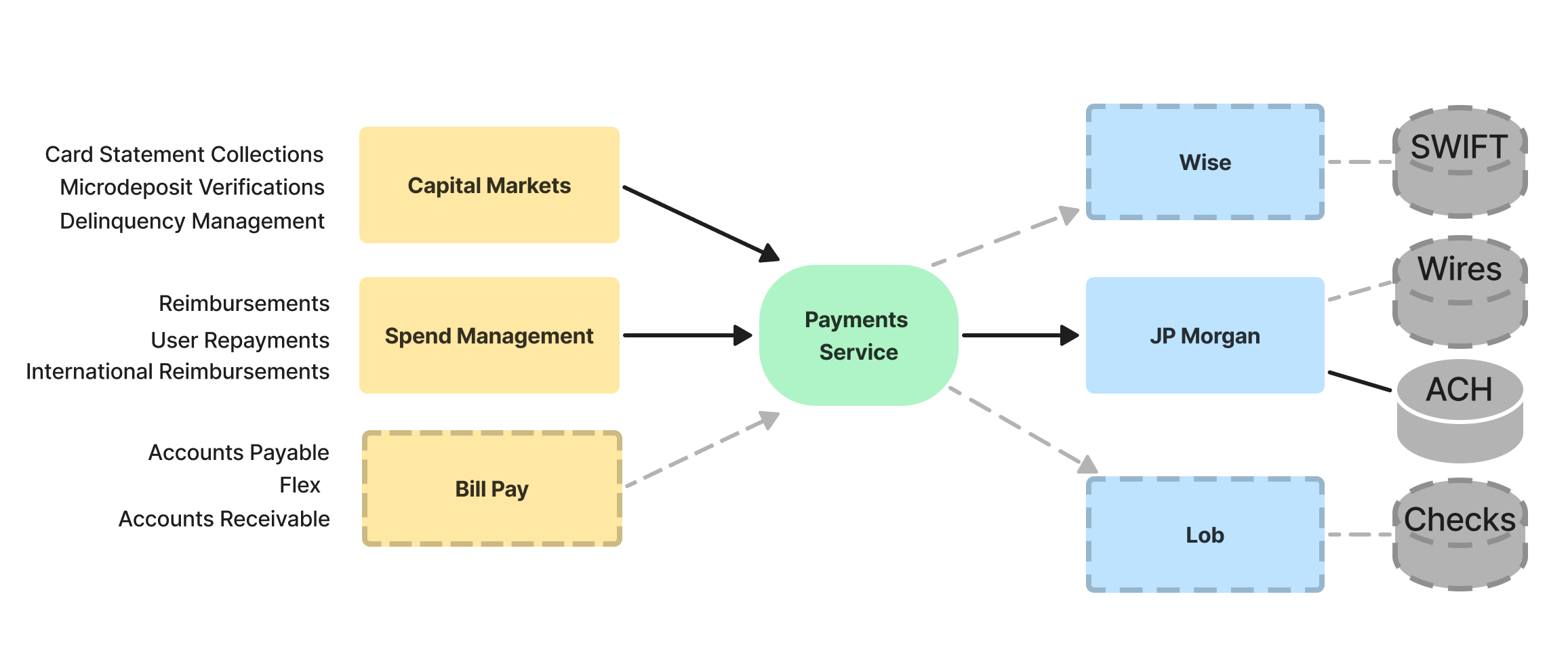 When the Card team built Ramp's first ever payments integration to support statement collections, they had a very specific use case in mind: collecting customer funds into a receivables account held at our partner bank JPM via ACH. As a result, they ended up engineering that assumption into the DNA of the system by building an integration tailored to the sole purpose of initiating ACH transfers into or out of a JPM account: