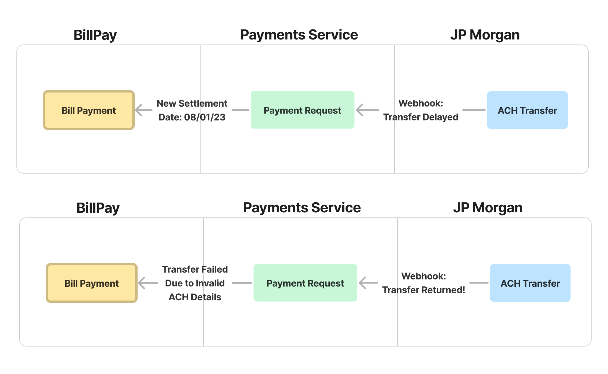 Of course, not all tech debt can be fully anticipated or avoided. Our first implementation of time-based settlement logic for ACH transfers involved setting an expected_settlement_date field on the TransferCanonical once we posted it to its corresponding provider. Then, we could run a daily job to mark any transfers past their settlement date that were still in the PROCESSING state (i.e., had not received a return) as COMPLETED. However, just months into launching the platform, we ran into several limitations: