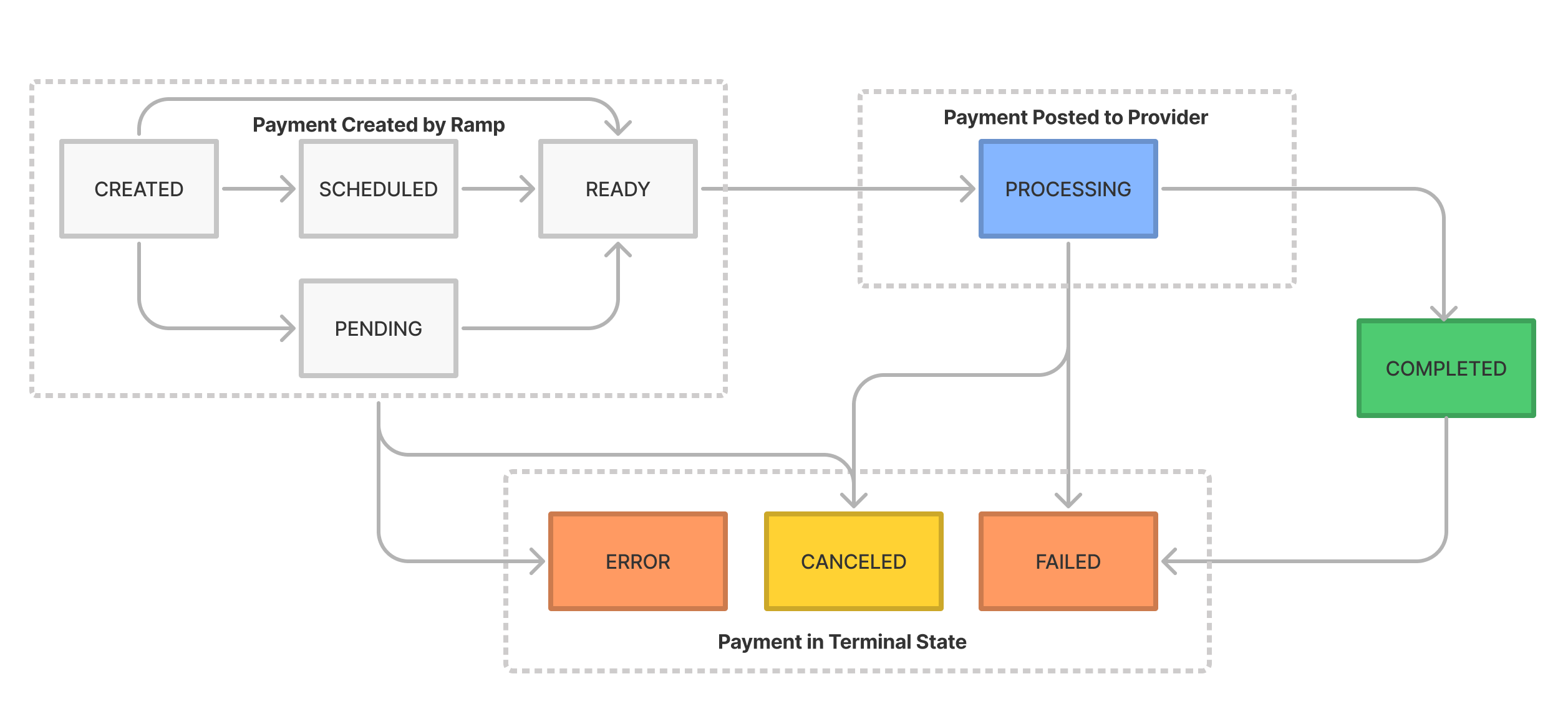 If this seems like a totally obvious design choice, it was anything but. Fully abstracting away the complexity of how all these different payment networks function from end clients was an explicit tradeoff decision to take on a ton of additional technical complexity in order to build a cleaner, more usable API. For example, one of the consequences of our decision to maintain a single interface was that we had to enforce a standardized state machine on all payments initiated via the platform, regardless of the rails or provider they were processed on: