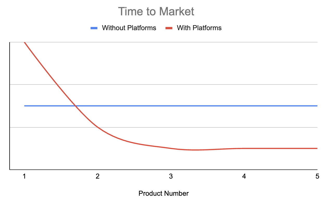At Ramp, one of our bread-and-butter sayings is "slope over intercept"—instead of focusing on the here-and-now, we try to discern for people and opportunities with the highest growth potential. Platforms are our secret sauce for high-slope engineering because what they provide is acceleration: we trade off some velocity in the short term in order to continually increase the speed at which we launch new products in the future. This tends to be a difficult mentality for fast-growing startups to adopt because it is so counterintuitive; too often, the first-order benefits from the conventionally accepted wisdom of "moving fast and breaking things" motivate young product teams to push off questions of maintainability and reusability to the distant future, because these benefits are so immediately visible. But in the long run, the second order effects of investing upfront time into thinking through the right abstractions become exponentially more valuable: